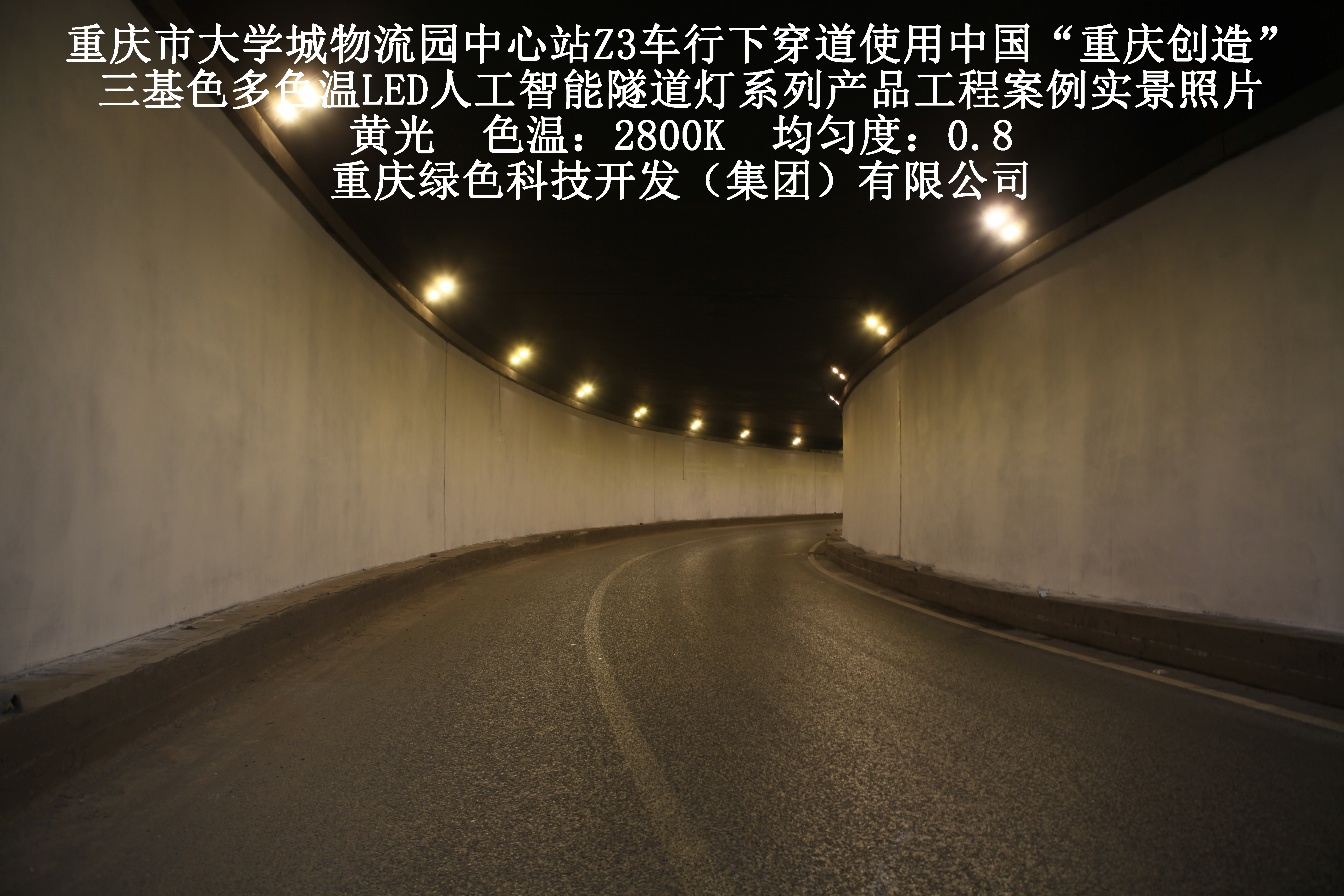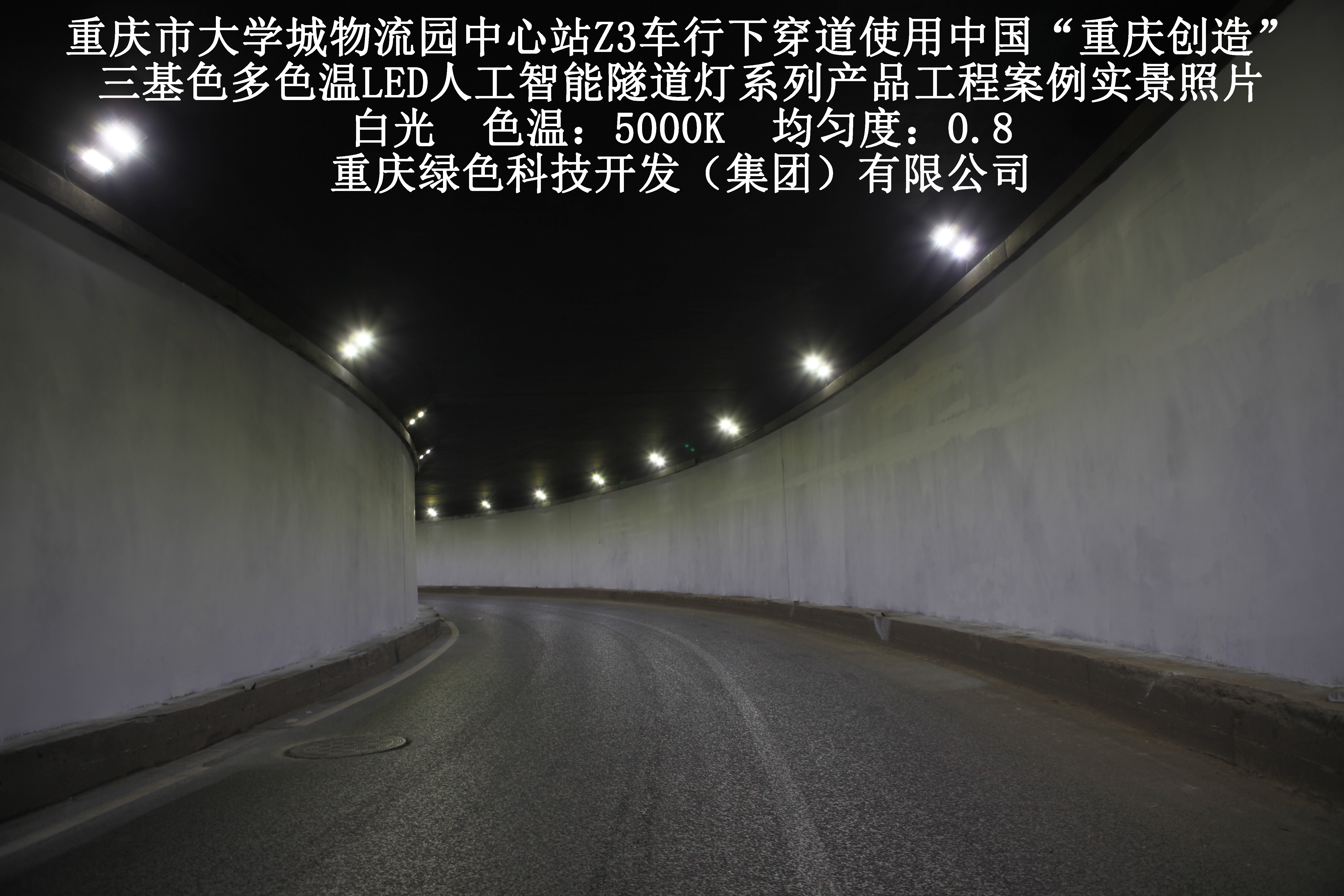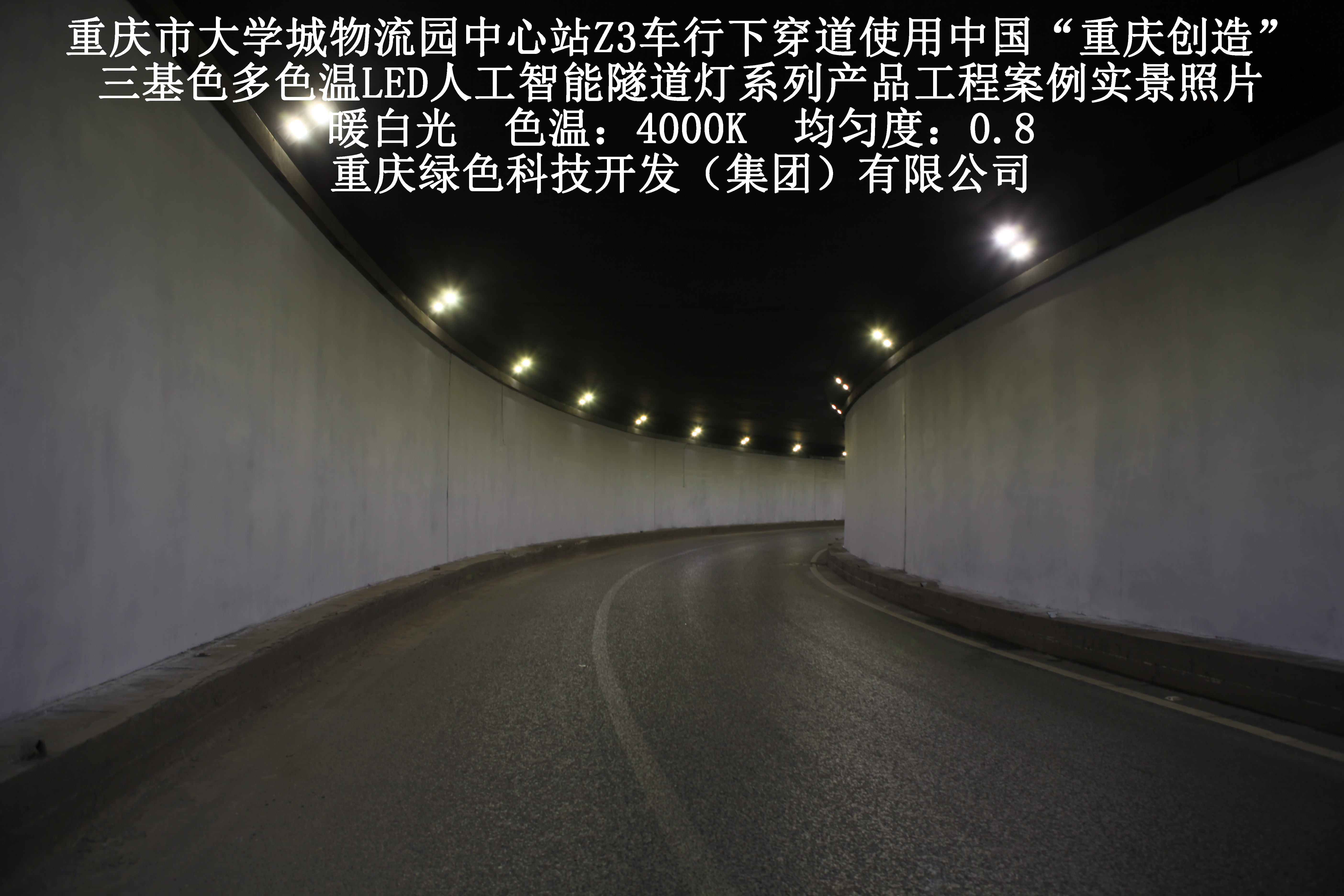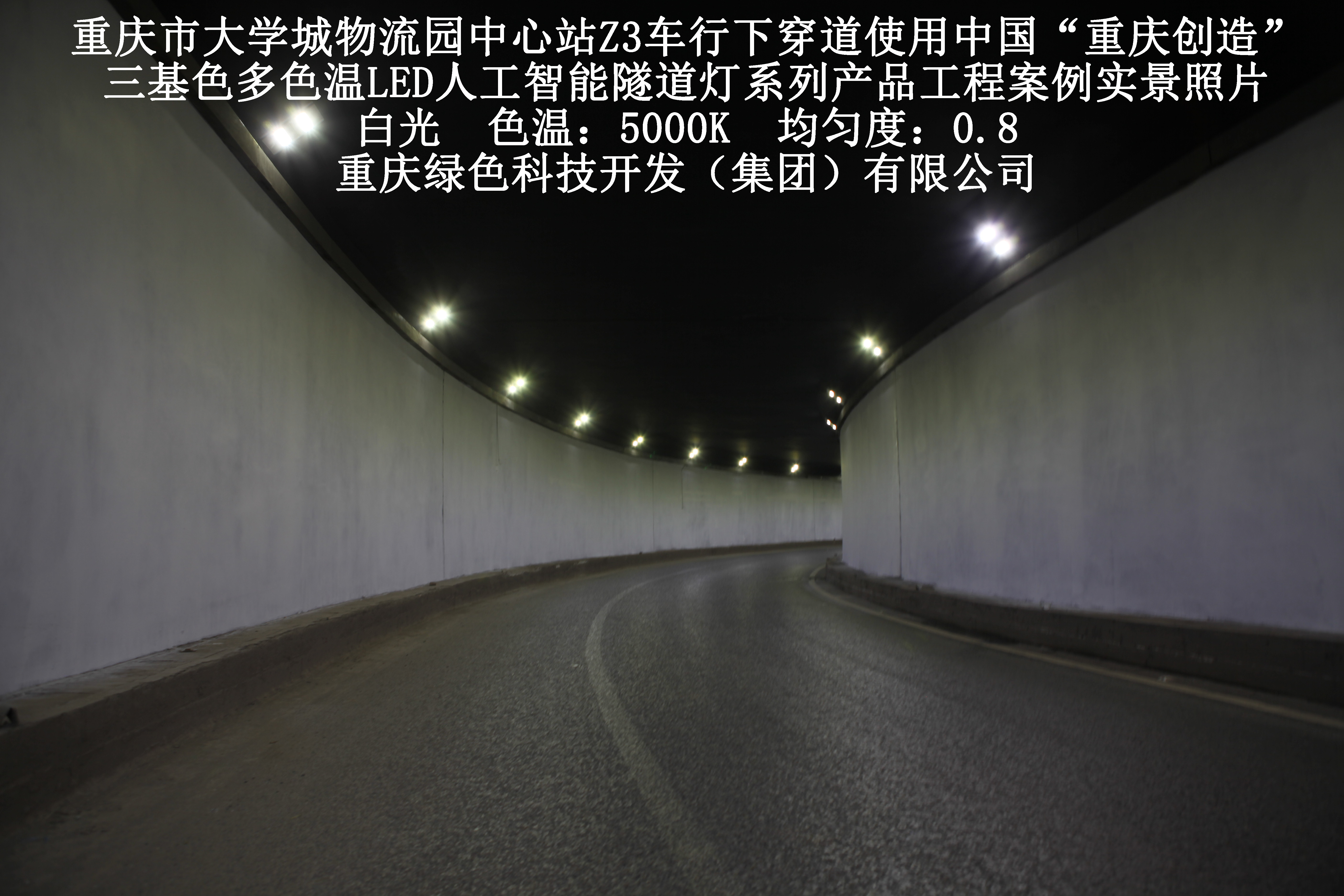 2019年3月,重慶市大學(xué)城物流園中心站Z3車行下穿道使用我司自主研發(fā)制造的,重慶“中國創(chuàng)造”三基色多色溫LED人工智能隧道燈系列產(chǎn)品,實施了市政設(shè)施品質(zhì)提升工程(工程案例實景照片附后)。此項目的實施,極大地提高了隧道內(nèi)照明清晰度、燈光均勻度、舒適度及照明安全性,實現(xiàn)了隧道照明系統(tǒng)的智能化管理。
