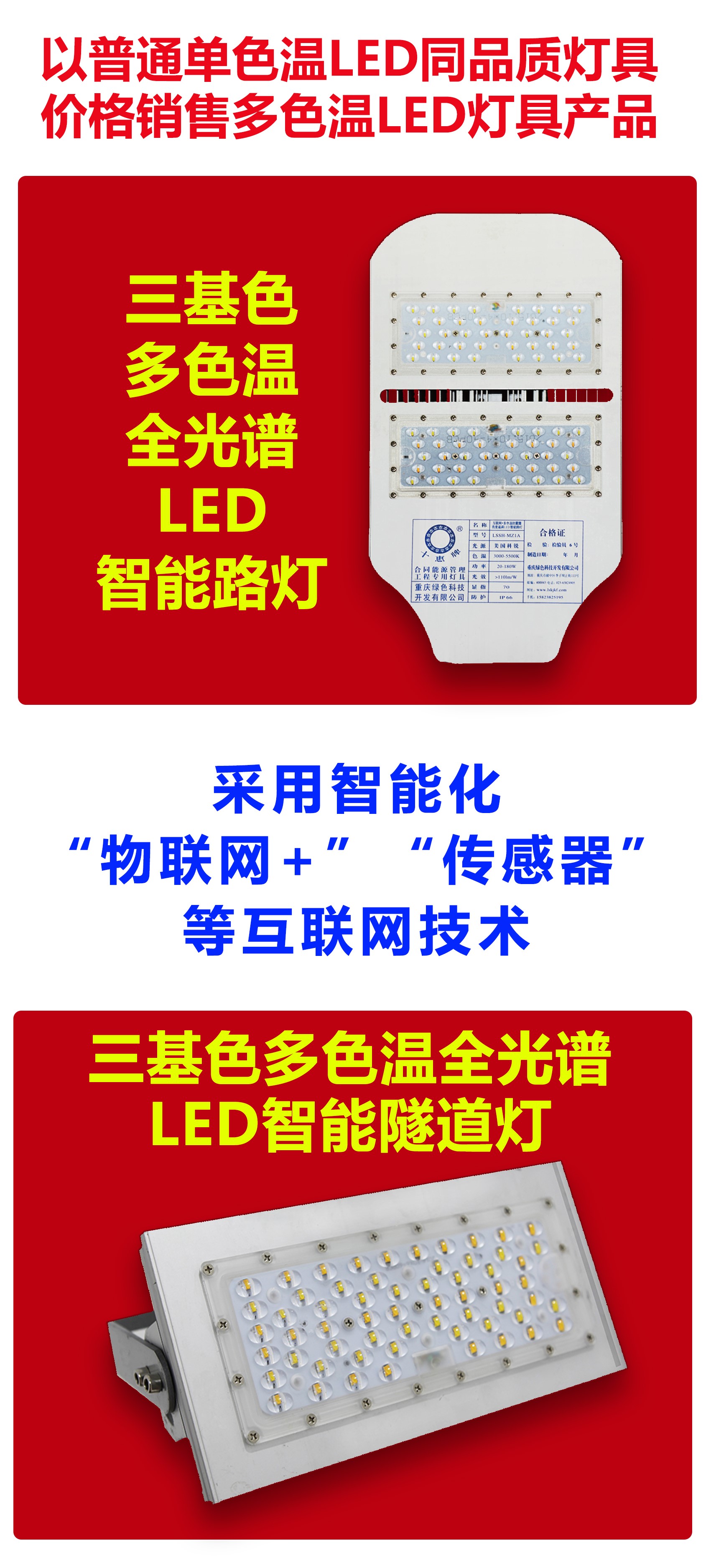 重慶“中國(guó)創(chuàng)造”三基色多色溫全光譜LED人工智能路燈技術(shù)是世界城市路燈照明領(lǐng)域淘汰普通單色溫LED路燈的先進(jìn)制造技術(shù),市場(chǎng)前景巨大。為了進(jìn)一步開拓多色溫LED智能路燈照明市場(chǎng),重慶綠色科技開發(fā)(集團(tuán))有限公司(以下簡(jiǎn)稱我司)擬尋覓誠(chéng)實(shí)守信、具有實(shí)力的LED電源制造公司、LED路燈燈具制造公司合作,整合資源優(yōu)勢(shì),免費(fèi)開放多色溫全光譜LED智能路燈、智能終端控制器制造技術(shù),在合作期間免費(fèi)提供國(guó)家級(jí)“智慧城市”城市照明夜景燈飾四級(jí)考評(píng)管理共享平臺(tái)使用,通過技術(shù)共享,實(shí)現(xiàn)共同對(duì)外銷售,達(dá)到雙贏的目的,請(qǐng)有意合作者與我們聯(lián)系……