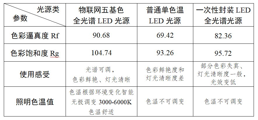 圖2 物聯(lián)網五基色全光譜多色溫LED光源與普通單色溫LED光源、一次性封裝LED全光譜光源參數(shù)對比